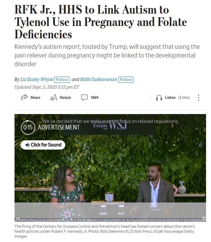 HHS officials have not given details on the planned content of the report. In a Sept. 8 appearance on Bloomberg TV, Food and Drug Administration Commissioner Dr. Marty Makary called the Wall Street Journal’s reporting “premature,” stating that the report had not yet been written.