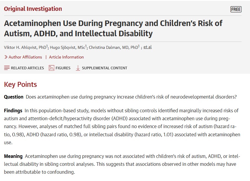 Lee was a co-author of a study of nearly 2.5 million Swedish children published last year that, like some other studies, found an association between acetaminophen use during pregnancy and a slightly increased risk of neurodevelopmental disorders. But the researchers found that other factors, not acetaminophen, were likely responsible for that finding. When the researchers compared siblings to better control for various factors, the association with acetaminophen disappeared. The results suggest that acetaminophen is not causing autism, and that the observed associations are spurious.