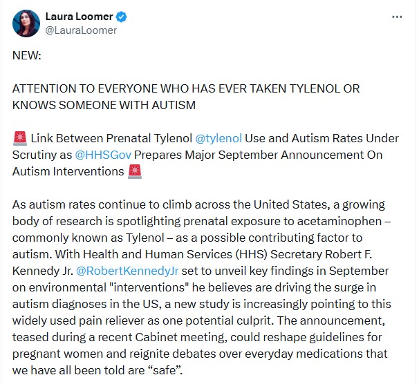 “ATTENTION TO EVERYONE WHO HAS EVER TAKEN TYLENOL OR KNOWS SOMEONE WITH AUTISM,” conservative activist Laura Loomer posted Sept. 2 on X, accompanying her text with police car light emojis. “Link Between Prenatal Tylenol @tylenol Use and Autism Rates Under Scrutiny as @HHSGov Prepares Major September Announcement On Autism Interventions.”