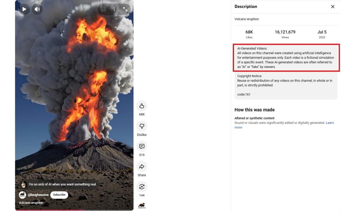 The YouTube channel, which has over 200,000 subscribers, has shared multiple AI-generated clips of natural disasters such as volcanoes and hurricanes.