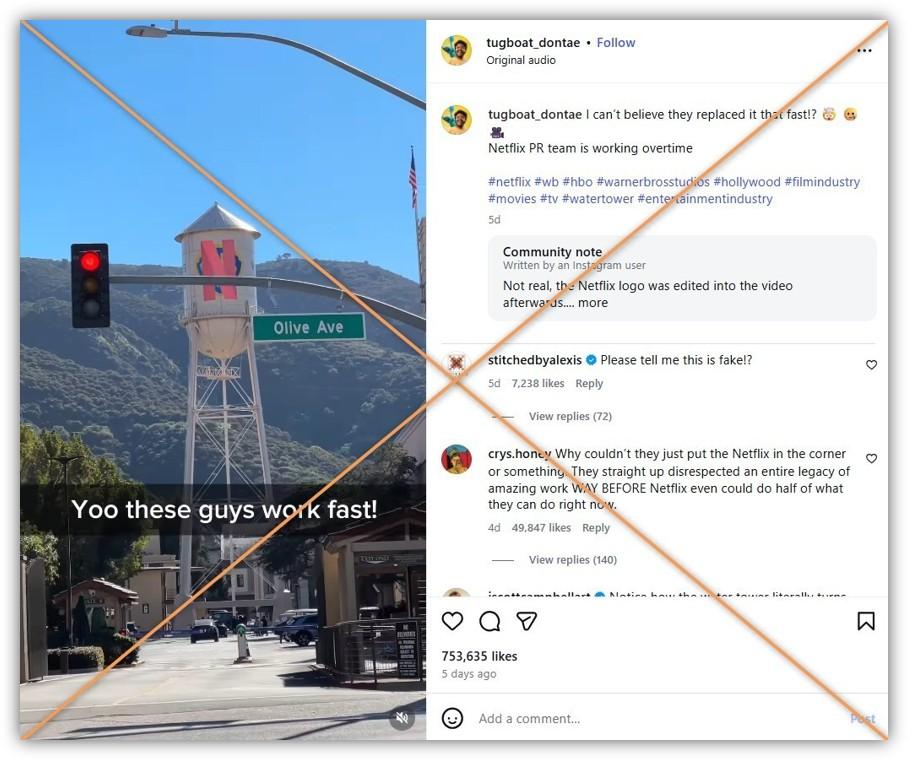 The video of the Netflix logo painted over the Warner Bros. water tower, however, is not authentic.