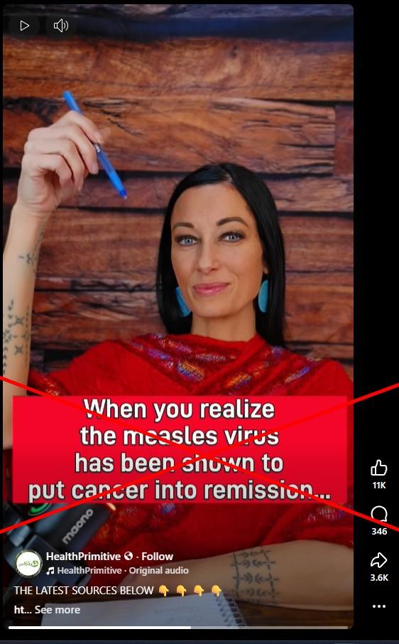 "When you realize the measles virus has been known to put cancer into remission... and they spent the last 50 years convincing you it's one of the deadliest threats to humanity," says text over a December 13, 2025 Facebook video.