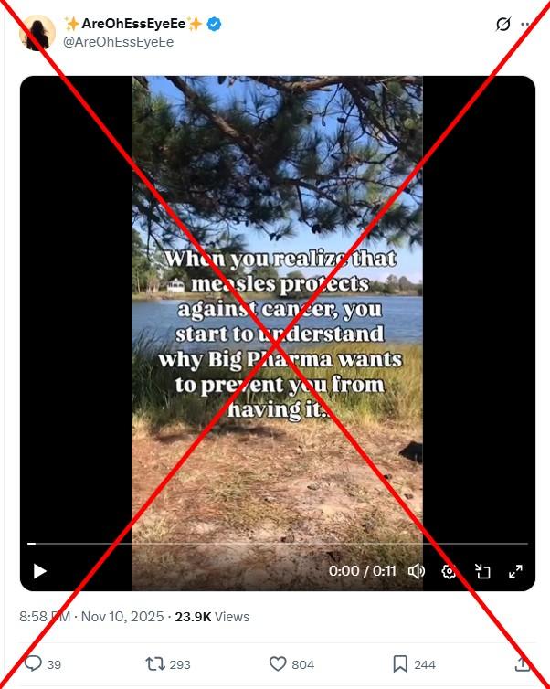 Several other posts shared throughout 2025 on X, Instagram, Facebook and TikTok spread similar claims alleging that Mayo Clinic proved measles guards against cancer, and that the research shows "why Big Pharma wants to prevent you from having it."