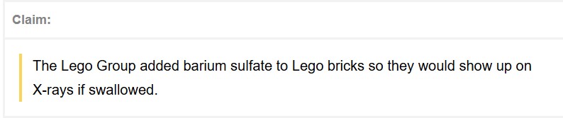 A rumor has circulated online since at least April 2020 that the Lego Group added barium sulfide, a chemical compound that shows up well in X-rays, to Lego bricks as a safety precaution in case children swallow them.