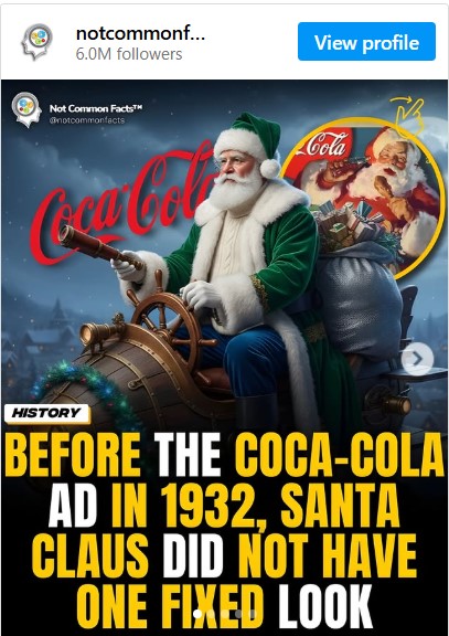 Over the years, people on social media have credited the modern image of Santa Claus to Coca-Cola. Some have said (archived) that Santa did not have one fixed look (archived) before a 1932 Coca-Cola advertisement, whereas others have gone so far as to claim Santa never wore red (archived) until the soft drink company rebranded him. The rumors rely heavily on the fact that Santa's red-and-white suit matches the colors central to Coca-Cola's branding.