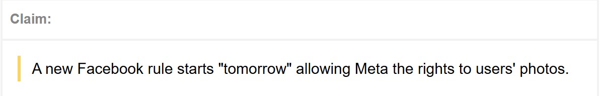 In December 2025, Facebook users shared a rumor claiming Meta signed into policy a "new Facebook rule" allowing the company the rights to users' photos starting "tomorrow." According to the posts, a lawyer advised "60 Minutes" to post about it on social media, advising users to publish a message effectively barring Meta from using their personal data.