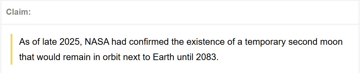 In late December 2025 and early January 2026, online rumors claimed NASA had confirmed an enormous discovery in outer space: a temporary "second moon" that would "remain in orbit" beside Earth until 2083.