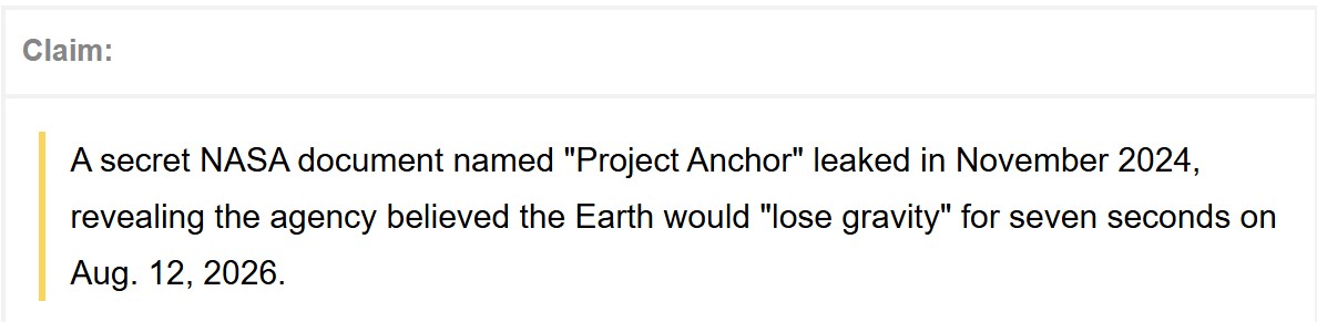 The post's caption — presented in full later in this article — further claimed: "In November 2024, a secret NASA document titled 'Project Anchor' leaked online. The project's budget is $89 billion, and its goal is to survive a 7-second gravitational anomaly expected on August 12, 2026, at 14:33 UTC." The post estimated there would be "40 million deaths from falls," "infrastructure destruction," "economic collapse lasting over 10 years" and "mass panic."