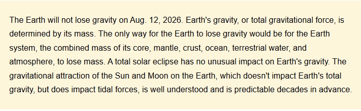 In short, while NASA's website said a total solar eclipse would occur on Aug. 12, 2026, the rumor about "Project Anchor" and gravity loss was false.