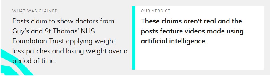 Social media posts that appear to show doctors applying patches then losing weight aren’t real and were made using artificial intelligence (AI).