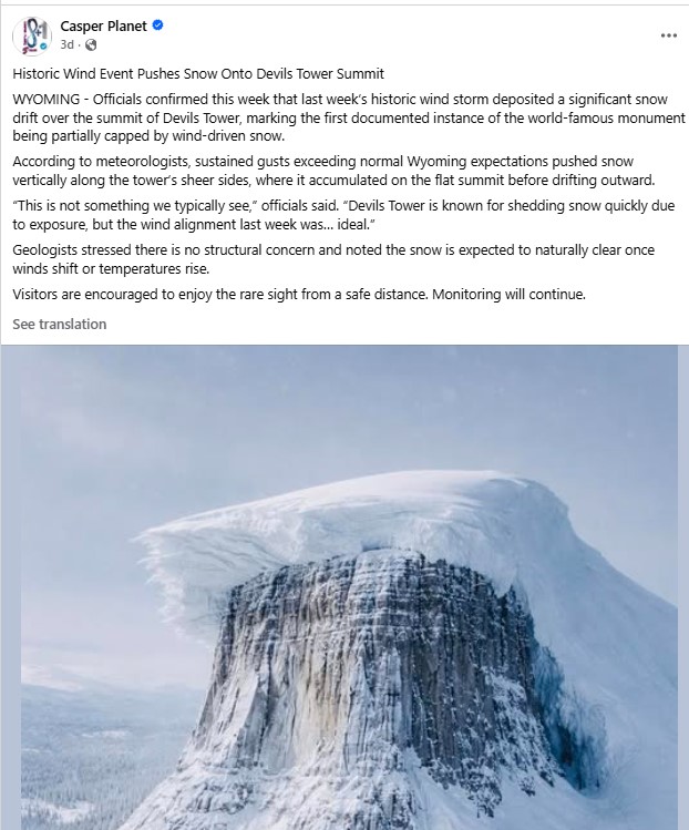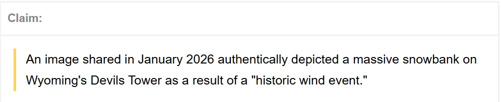 In January 2026, a rumor circulated online claiming that an image authentically showed a massive snowbank on Wyoming's Devils Tower National Monument — known as "Matȟó Thípila" to the Lakota  as a result of a "historic wind event."