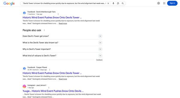 Some readers seemed to interpret the rumor as a factual recounting of real-life events. However, there was no evidence a massive wind storm created a snow shelf of the size shown in the image on Devils Tower. A Google search of one of the reported quotes by an "official" turned up results only related to the social media post. If a U.S. National Park Service official had actually shared the quote with any credible media outlet, Google search results would reflect that: