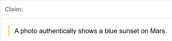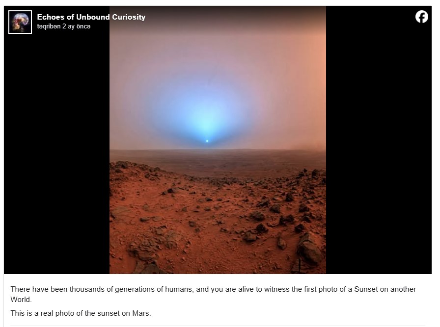 In early 2026, a photo (archived) circulated online that claimed to authentically show a blue sunset on Mars.