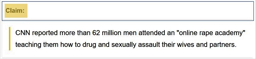 A rumor social media users discussed in April 2026 claimed CNN reported that more than 62 million men attended an "online rape academy" where they were taught how to drug to sleep and then sexually assault their wives and partners. One Snopes reader emailed to ask, "Is there a rape club online that gets millions of viewers?"