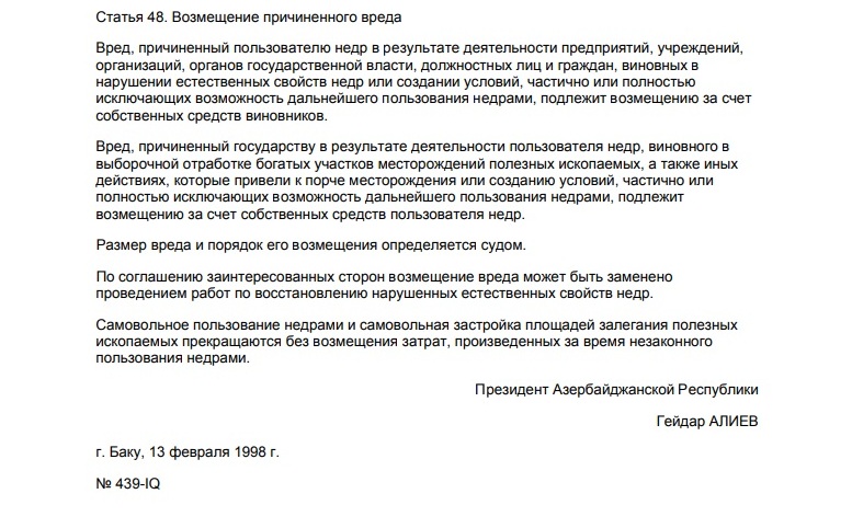 Говоря о «внутренних правовых основах и международных обязательствах», необходимо отметить, что в 1998 году в Азербайджане был принят закон «О недрах».