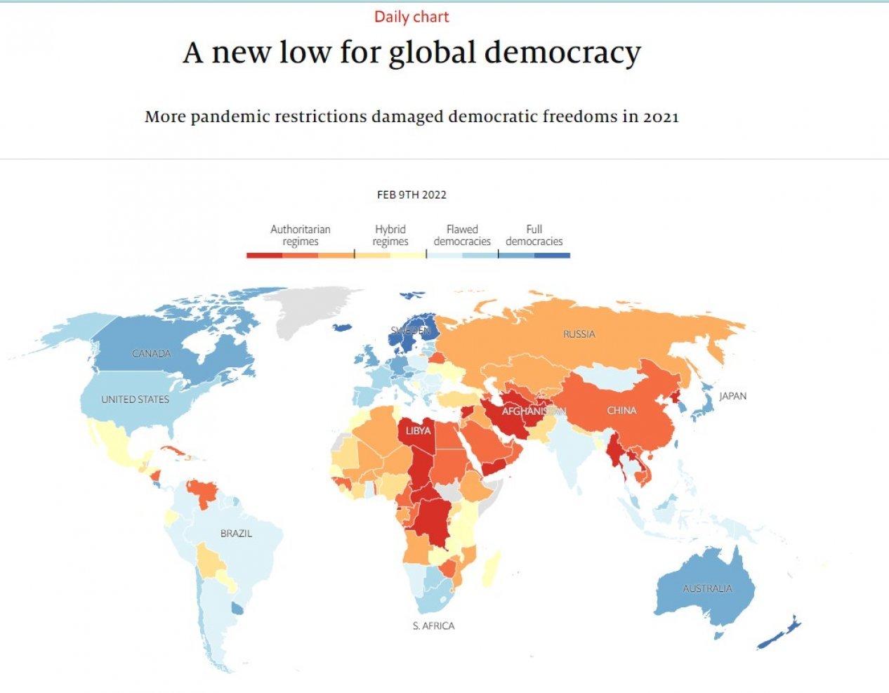 Гибридные режимы — это государства, в которых в ходе выборов имеют место определённые нарушения, регулярно препятствующие их справедливому и свободному проведению. У этих стран обычно есть правительства, которые оказывают давление на политических оппонентов, несамостоятельные судебные органы, широко распространённую коррупцию, притеснения и давление на средства массовой информации, недействующее верховенство права и более выраженные недостатки, чем у несовершенных демократий в сферах слаборазвитой политической культуры, низкого уровня участия в политике и проблем в функционировании управления. Наконец, авторитарные режимы (автократии) — это страны, где политический плюрализм исчез или крайне ограничен. Эти страны часто являются абсолютными монархиями или диктатурами, могут иметь некоторые традиционные демократические институты, но со скудным значением, нарушения и злоупотребления гражданскими свободами являются обычным явлением, выборы (если они происходят) не являются справедливыми и свободными, средства массовой информации часто принадлежат государству или контролируются группами, связанными с правящим режимом, судебная власть не является независимой, и существует вездесущая цензура и подавление правительственной критики.