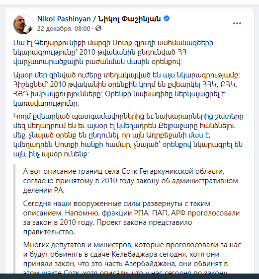 Теперь об "участке Сотк-Хознавар" о котором говорит Пашинян. Армяне утверждали, что золотоносное месторождение Зод (Сотк-арм.) в Кяльбаджаре принадлежит Армении. Однако официальные документы свидетельствуют, что по меньшей мере, 74% месторождения приходится на территорию Азербайджана. Интересно, что это в свое время признал и премьер-министра Армении Никол Пашинян.