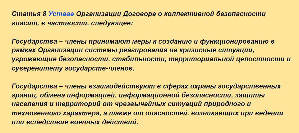 В статье 4 Договора о коллективной безопасности отмечается, что, если одно из государств – участников подвергнется агрессии (вооруженному нападению, угрожающему безопасности, стабильности, территориальной целостности и суверенитету), то это будет рассматриваться государствами – участниками как агрессия (вооруженное нападение, угрожающее безопасности, стабильности, территориальной целостности и суверенитету) на все государства – участники настоящего Договора.