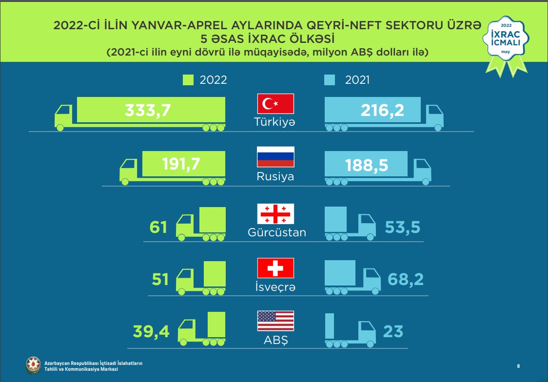 За отчетный период Азербайджан экспортировал ненефтяных продукции на сумму 965,5 миллиона долларов, что на 268,6 миллиона долларов или на 38,5% больше, чем за соответствующий период 2021 года. За этот период наша страна экспортировала ненефтяной продукции на сумму 333,7 млн ​​долларов в Турцию, 191,7 млн ​​долларов в Российскую Федерацию, 61 млн долларов в Грузию, 51 млн долларов в Швейцарскую Конфедерацию и 39,4 млн долларов в США . Обзор экспорта Азербайджана» , 2022 г., январь-апрель)