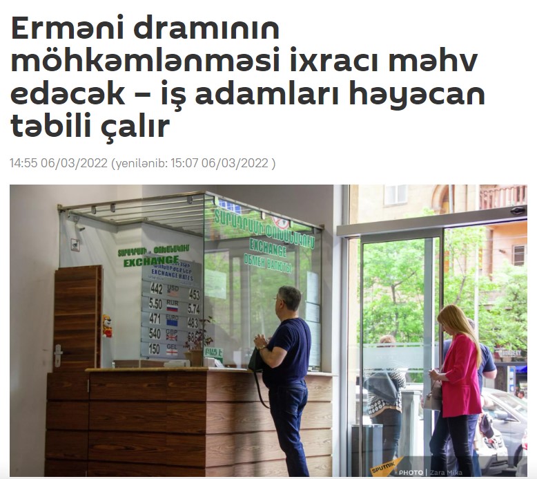 Разрушительное влияние глобальной инфляции на экономику Армении и искусственные спекуляции на валютном рынке страны наносят серьезный ущерб предпринимателям, которые чаще всего экспортируют товары в зарубежные страны. Армянские СМИ пишут, что сейчас конкуренция азербайджанских товаров на международных рынках становится все более высокой и вытесняет армянские сельскохозяйственные товары. Поэтому за последние 2 месяца доля армянских экспортеров на рынке стран СНГ и ближнего зарубежья снизилась.