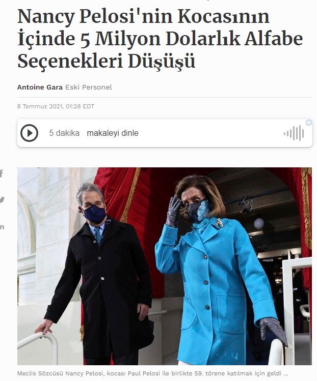 Похоже, что, поскольку торговля и брокерская деятельность занимают центральное место в убеждениях Нэнси Пелоси, рыночный меркантилизм доминирует в ее отношении к политике, парламентаризму, политической системе других стран и, что наиболее важно, к демократии, миру и правам человека. Его подход к политическим событиям производит впечатление настоящего уличного торговца. Печальная правда заключается в том, что Нэнси Пелоси, которая возглавляла Конгресс в политической истории Соединенных Штатов, на самом деле фальшивый и лицемерный политик, мошенница, которая использует свою неограниченную законодательную власть для развития своего грязного семейного бизнеса, которая пожертвовала финансовыми средствами Америки и инвестиционными рынками для своих личных интересов.