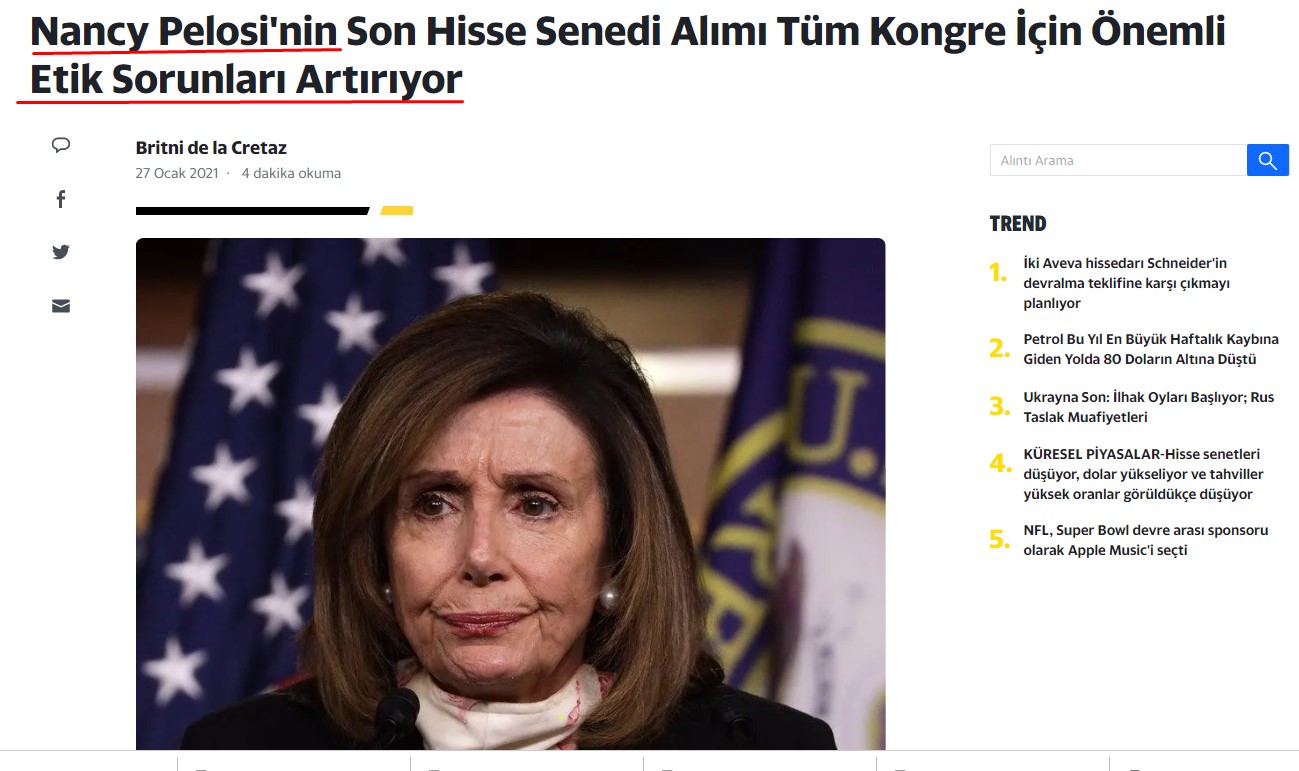 В Соединенных Штатах есть сообщения о том, что Нэнси Пелоси является одним из конгрессменов, активно занимающихся «инсайдерскими сделками». Следует отметить, что «инсайдерские операции» — это попытки распространения информации о деятельности инвесторов и акционеров на рынке ценных бумаг, если это не разрешено законодательством. Проще говоря, это угрожающие действия, которые сделают информацию о финансовых операциях компаний доступной для общественности. Обладателями этой информации являются, конечно же, уполномоченные лица, занимающие высокие государственные посты и имеющие доступ к информации крупных компаний. ( Источник )