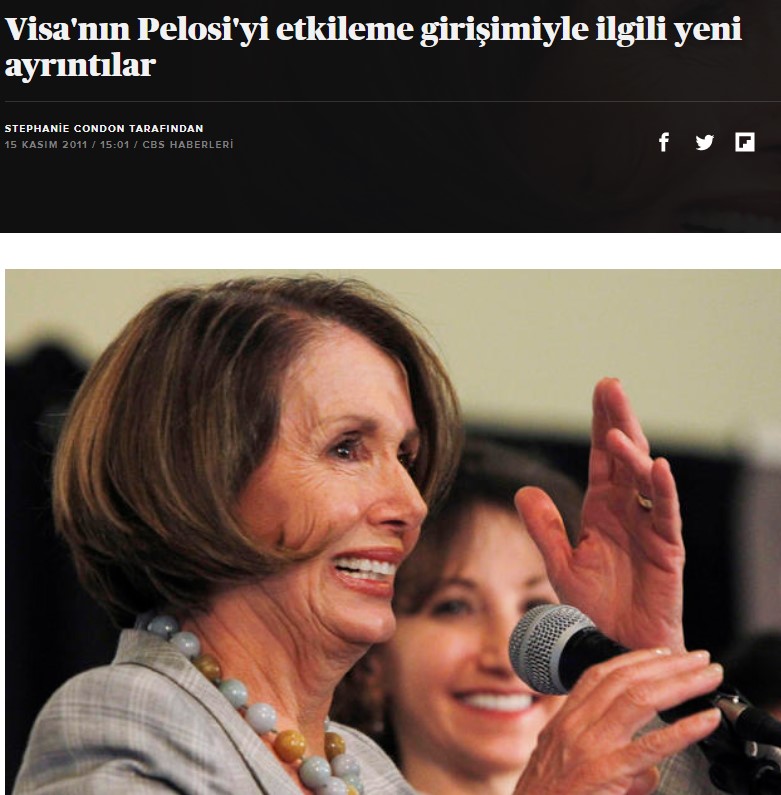 Так, в 2008 г., во время тяжелого финансового кризиса в США, Н. Пелоси и ее супруг Пол Пелоси злоупотребили ситуацией на финансовых рынках и путем угроз завладели акциями международной платежной компании Visa. Затем Пелоси запустила свой хитрый сценарий и лоббировала уже свою Visa на законодательном уровне, продвигая в палате законопроект о предотвращении монополии карточных компаний на американском рынке. В результате законопроект о свободной деятельности кредитных провайдеров не принимается, свободная конкуренция для процессинговых компаний ограничена. Пелоси видит результаты ”своего труда“, когда семья покупает 5000 акций Visa по начальной цене 44 доллара каждая, а через 2 дня получает высокую прибыль, продавая одну акцию по 64 доллара.( Источник )