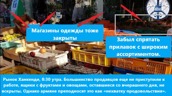 Однако одна из главных пропагандисток сепаратистского режима Сирануш Саргсян поделилась фотографией с якобы закрытого рынка 27 декабря и поделилась «душераздирающим» твитом, в котором говорилось: "Одна мать пришла и попросила за килограмм картофеля и моркови, чтобы сварить суп или пюре для своих детей".