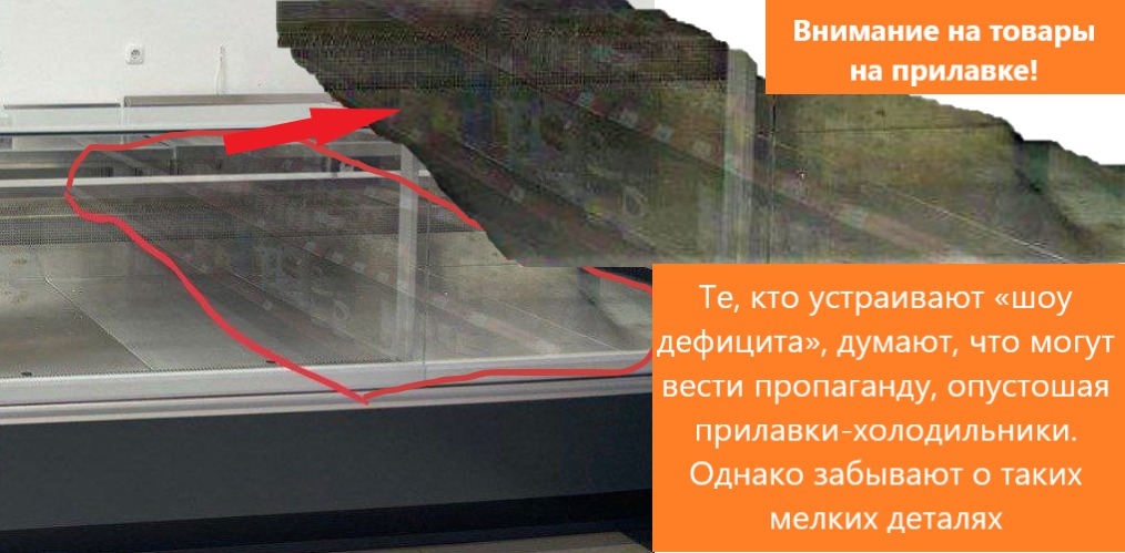 Факт 6. В одном из магазинов выставлен пустой холодильник. Но те, кто вел эту пропаганду, забыли убрать замороженное мясо и рыбу, которые поставили перед магазинным холодильником, и оставили нам в "подарок" такую сцену разоблачения.