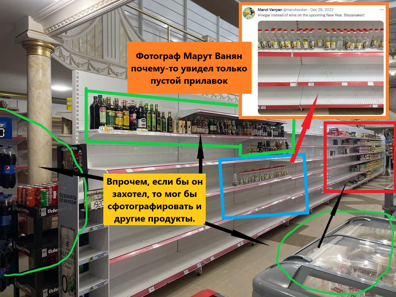 Факт 3. Пропагандист по имени Арман Татоян в очередной раз распространил ложную информацию о том, что "120 000 армян находятся в блокаде в результате политики Азербайджана", и добавил фотографии ханкендинских магазинов с пустыми прилавками. Одним из этих фотографий относительно большого размера поделился пользователь по имени Кеворк Осканян. Обратите внимание на эти скриншоты.