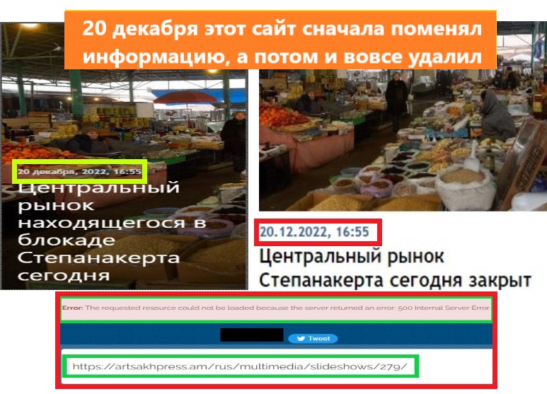 Факт 2. Сайт, являющийся основным пропагандистским рупором сепаратистов, 20 декабря поделился новостью о Ханкендинском рынке. Потом они изменили название новости на "Центральный рынок Ханкенди сегодня закрыт". На момент расследования мы вообще не нашли эту новость на сайте. Видимо, они поняли, что переборщили, и хотели обезопасить себя, полностью удалив новость с сайта.
