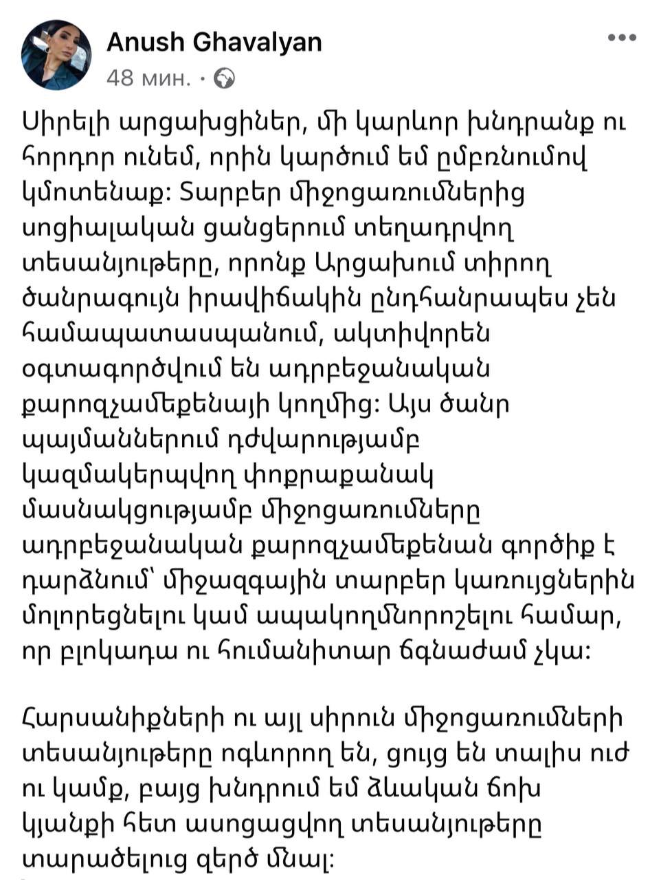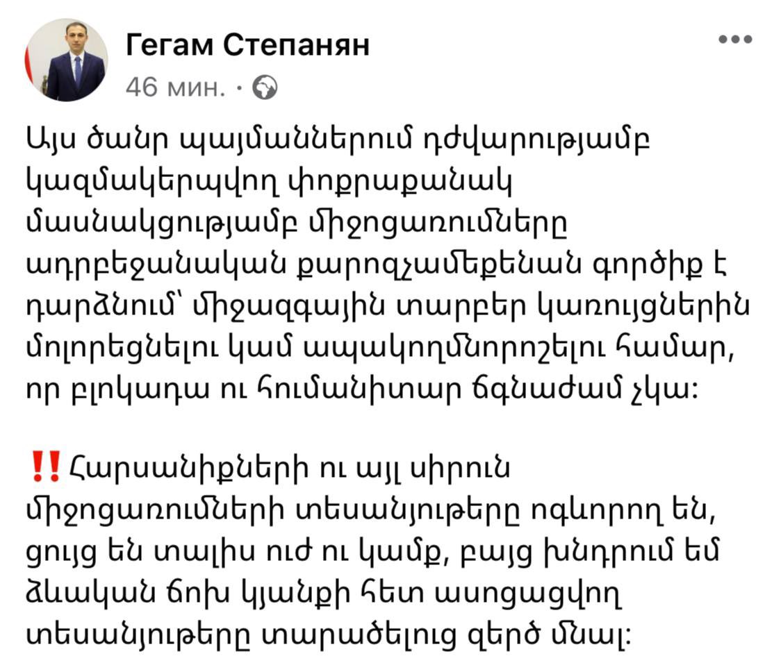 Сепаратисты делают все возможное, чтобы информация о событиях в Ханкенди и недовольстве местного населения не становилась актуальной и не приводила к общественным обсуждениям. Ситуация дошла даже до того, что представители режима запретили владельцам ресторанов и кафе делиться своими услугами и предложениями в своих аккаунтах в социальных сетях. Потому что деятельность самообслуживающих общепитов опровергает распространяемую ими в мире "блокадную" пропаганду.