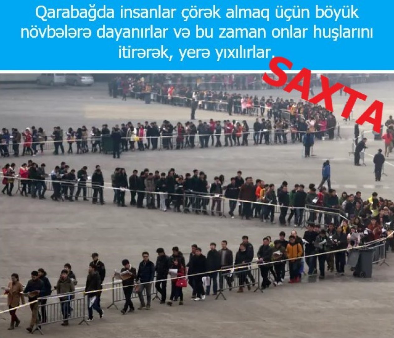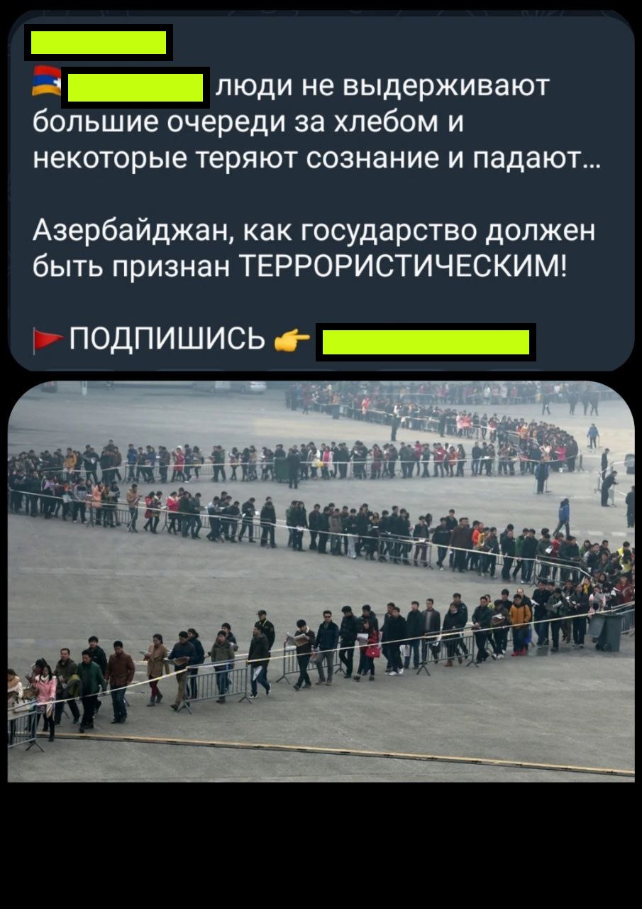 Один из армянских телеграм-каналов поделился постом о длинных очередях в Карабахе. В посте сообщается, что люди в Карабахе стоят в длинных очередях за хлебом, где теряют сознание и падают на землю.