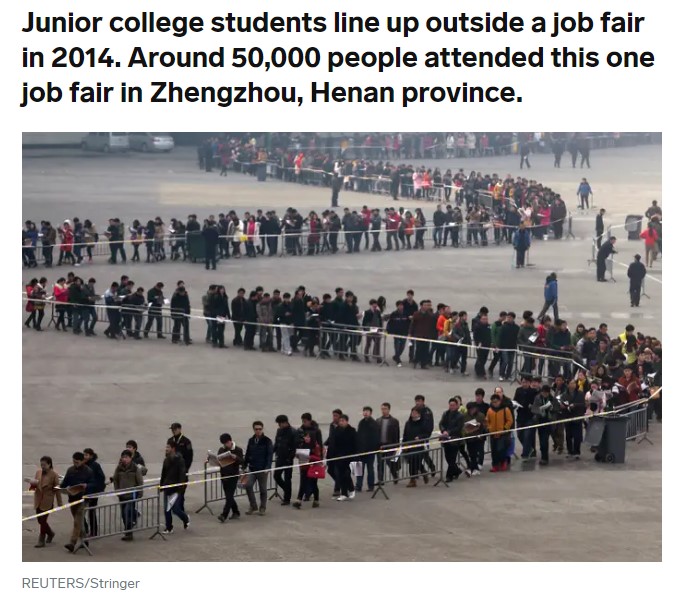 При поиске фотографии методом «обратного поиска» обнаруживается, что фотография старая. Оказывается, это фото было сделано репортером Reuters в 2014 году. Очередь стояла на ярмарке вакансий для студентов бакалавриата в Чжэнчжоу, провинция Хэнань, Китай. Ярмарку посетило около 50 000 соискателей.