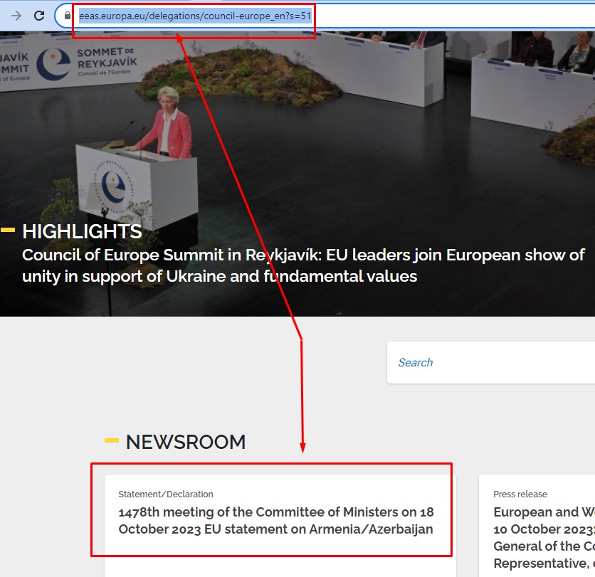 Если вы выполните поиск в разделах «Документы повестки дня», «Резолюция», «Рабочий документ», «Распространенный документ», «Отчеты», «Выступление», «План действий» по этой ссылке, то вы не найдете документ под названием «Заявление ЕС по Армении/Азербайджану»(EU statement on Armenia/Azerbaijan”)