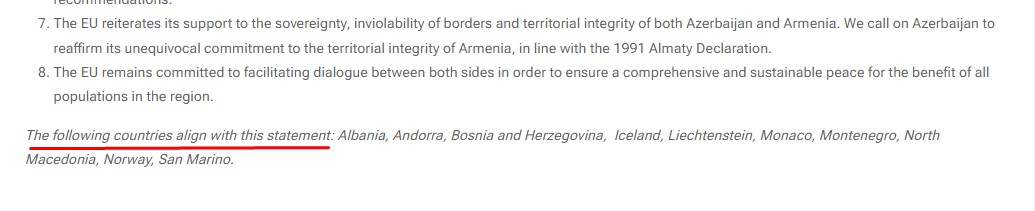 В «заявлении», которое начинается словами «Европейский Союз считает, что...», вывод Евросоюза подчеркивается четыре раза, а в конце Албания, Андорра, Босния и Герцеговина, Исландия, Лихтенштейн, Монако, Черногория, Северная Македония, Норвегия и Сан-Марино также «поддержали» это заявление, а не «подписали» его, как утверждают армянские СМИ.