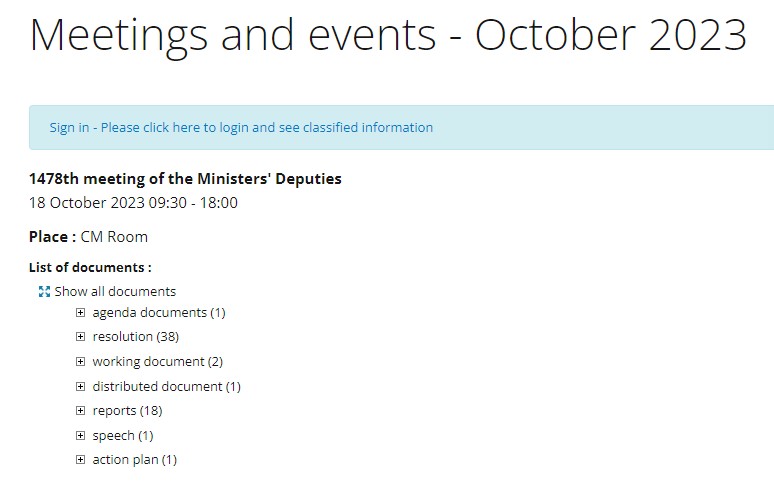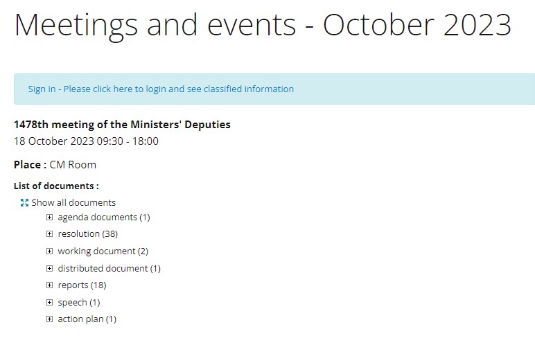 В результате исследования выяснилось, что согласно регламенту время проведения следующего заседания Комитета Министров, документы повестки дня, отчеты и информация о принятых решениях (не менее чем за две недели до дня заседания) размещен на сайте организации. Повестка дня последнего заседания 18 октября была добавлена на сайт 6 октября 2023 года.