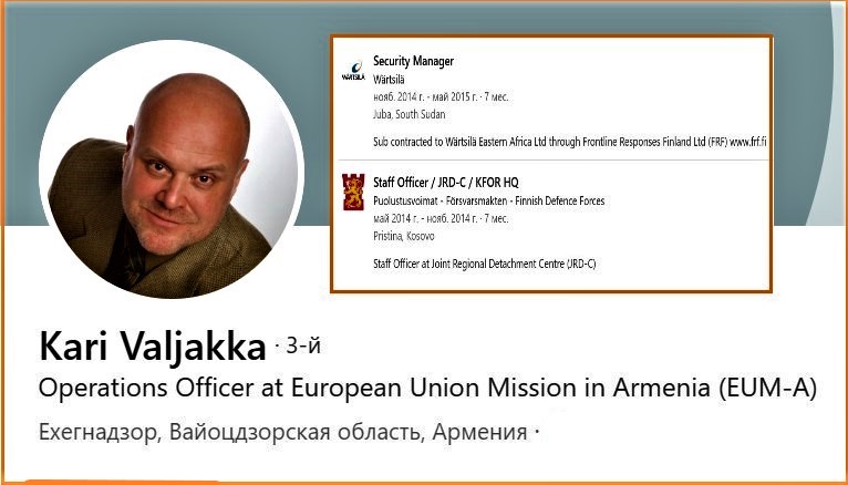 Кари Вальякка Оперативный офицер EUMA. Он окончил Финский колледж национальной обороны, затем Академию национальной обороны и дослужился до звания полковника. В разное время по специальности занимал должности консультанта по безопасности, начальника управления, офицера сил безопасности Судана. Профессиональный офицер военной разведки.