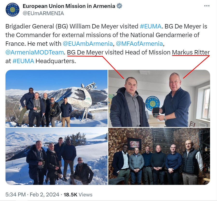 Военное предназначение гражданской миссии стало очевидным после визита бригадного генерала Уильяма Де Мейера из Национальной жандармерии Франции к условной границе между Азербайджаном и Арменией 2 февраля, где он в бинокль наблюдал за азербайджанскими территориями. Это свидетельствовало о том, что Франция использует «гражданскую миссию» в военных и разведывательных целях.
