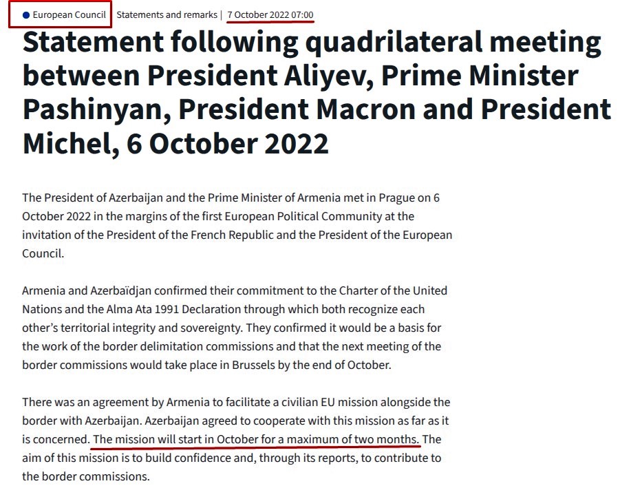 Еще 10 января 2023 года Президент Ильхам Алиев озвучил свое мнение по этому вопросу в интервью местным телеканалам. Глава государства сказал: «В ходе пражской встречи был один момент, который остался несколько в стороне от общего контекста. Это касалось отправки европейской наблюдательной миссии на территорию Армении граничащую с регионами Азербайджана. Этот вопрос также был широко обсужден. Одним из предложений было отправить эту миссию также в Азербайджан. Мы возразили против этого, однако согласились отправить эту миссию в Армению. Тогда обсуждалось, что эта миссия будет краткосрочной, в составе 40 человек и продлится всего два месяца. Я также с этим согласился. Но затем, по какой-то причине это обсуждение, то есть соглашение, было нарушено. Это, конечно, очень разочаровывающий момент. Потому что мы серьезные люди, здесь ведутся серьезные разговоры. Если мы согласовываем что-то даже устно, мы должны этому следовать до конца. Как такое может быть? Через некоторое время высокопоставленный чиновник Евросоюза заявил, что миссия будет продлена. После этого министр иностранных дел Франции заявил, что мы продлим миссию. Конечно, мы немедленно приняли меры и потребовали разъяснений. В чем дело? Как вы собираетесь это продлить? Вы ведь согласовали отправку этой миссии с нами. Почему? Потому что это будет находиться рядом с нашей границей. Как это может быть не согласовано с нами. Срок этой миссии должен был закончиться 19 декабря, и вы должны были вернуться на свои места.».