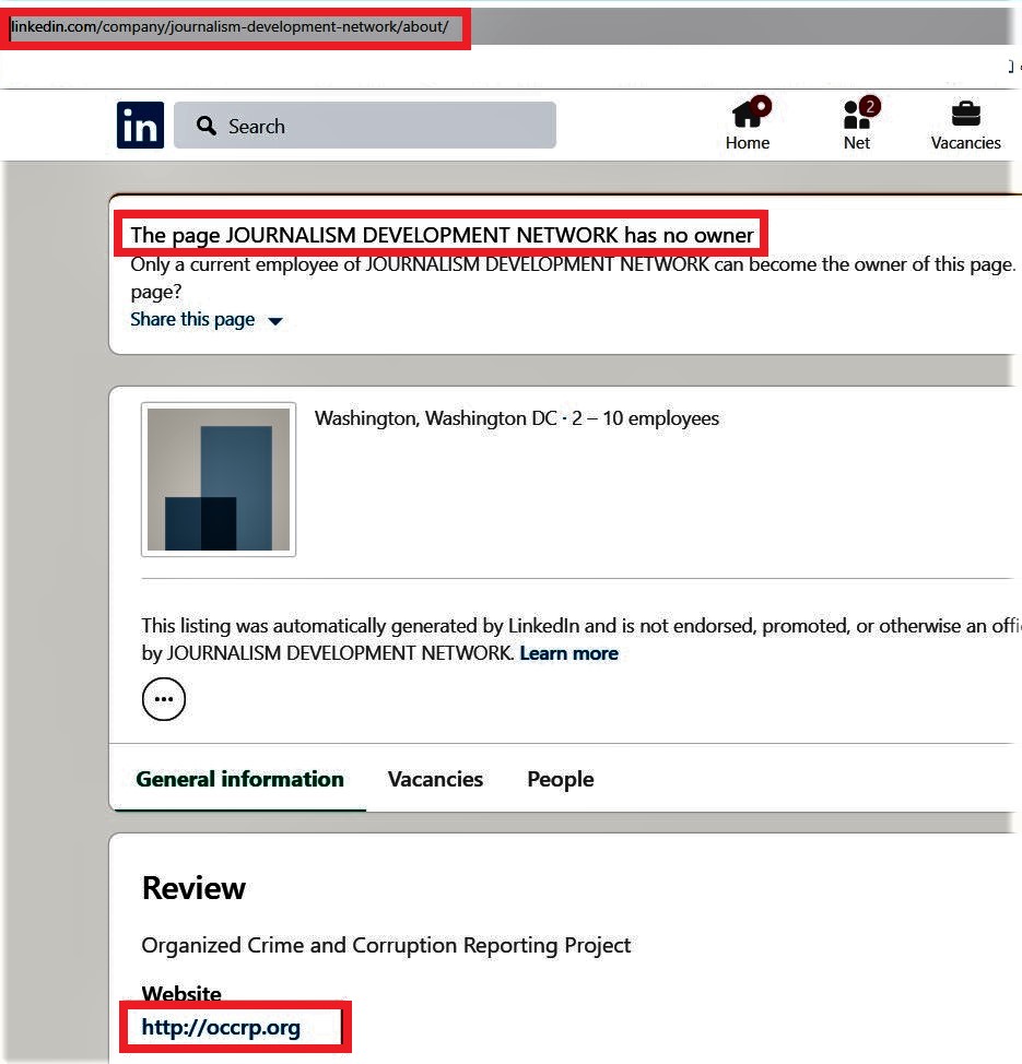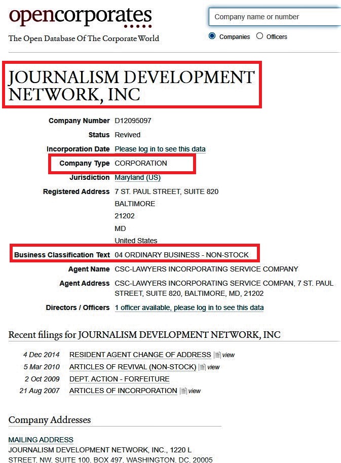 Здесь создан настоящий информационный лабиринт, который исследователям сложно понять с первого взгляда. Например, в интернете невозможно найти ни названия организации «The Journalism Development Network», ни её официального сайта. Даже страница на LinkedIn пуста.