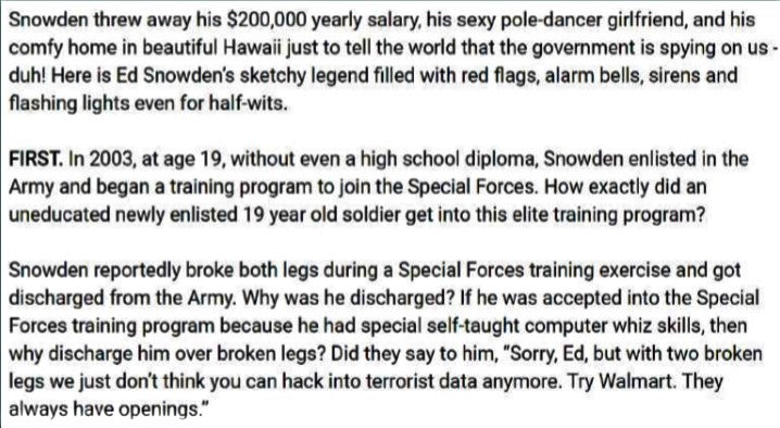 С этой целью было решено создать новый скандал, не независимый как Джулиан Ассанж, а поддерживаемый и направляемый государством, и протестировать его в рамках «дела Эдварда Сноудена». Создалось впечатление, что сотрудник Агентства Национальной Безопасности (NSA) Э. Сноуден обнародовал файлы, принадлежащие учреждению, в котором он работал, из-за личного убеждения и протеста. Тем самым был послан сигнал общественности: «Спецслужбы США следят за гражданами». Ведь здесь никакой необычной, сенсационной информации нет. Нет никого, кто бы этого не знал. Аналитики даже с сарказмом писали, что Сноуден пожертвовал работой в престижном месте с зарплатой в 200 тысяч долларов в год, дорогим домом и знакомыми, чтобы сказать: «...государство следит за нами». Странно то, что в шоу «Дело Сноудена» общественность шокировало не только раскрытие всем известного сообщения, но и несоответствия в биографии вымышленного предателя, что также указывало на примитивность подготовки проекта. Например, оказывается, что Сноуден не только не работала в Национальном Агентстве Безопасности, но и вовсе не служила в армии США.