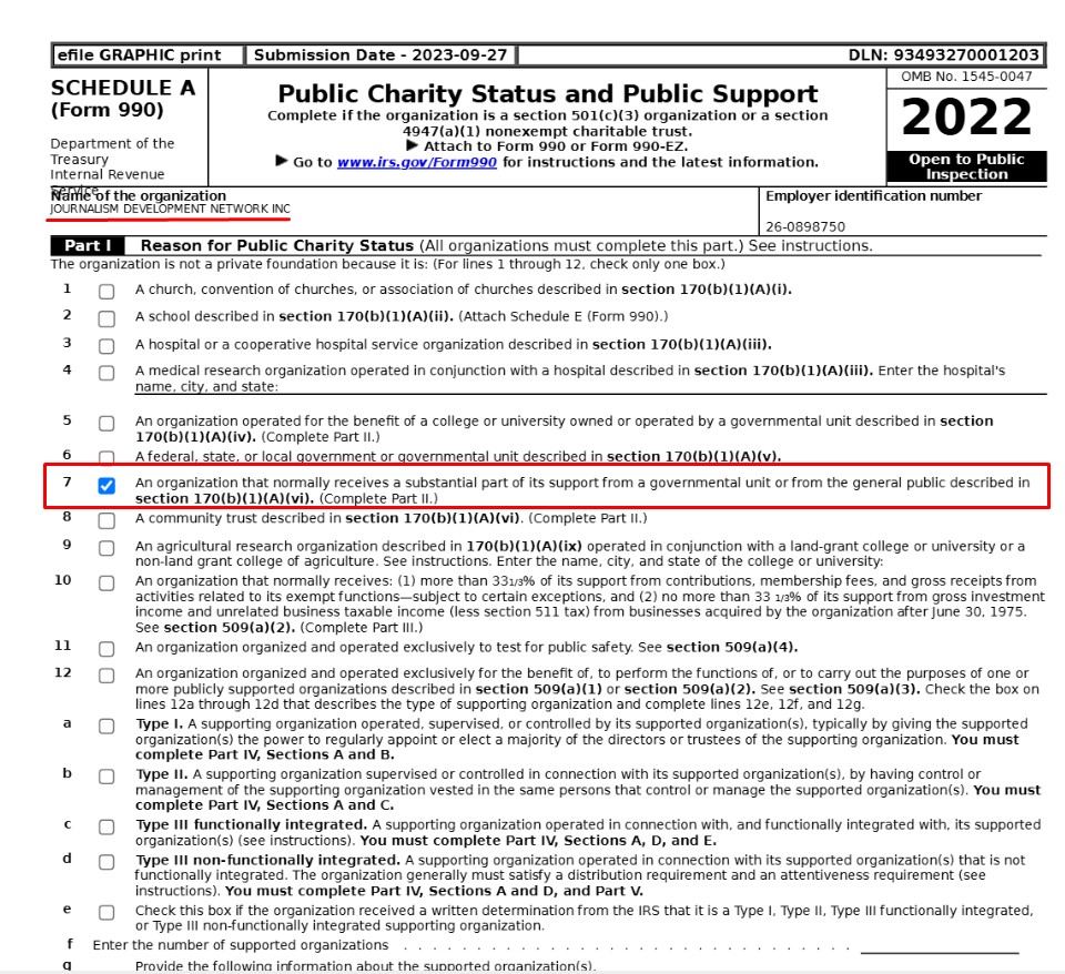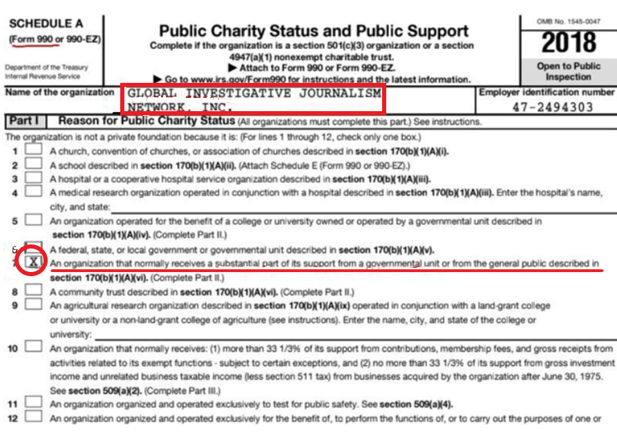 С другой стороны, Налоговая служба США освободила от уплаты налога на прибыль и другую организацию, являющуюся частью OCCRP, — GIJN. На сайте Налоговой службы США в налоговой декларации за 2015-2018 годы в строке 7 (обозначено, что организация в основном финансируется государственными учреждениями/правительственными организациями США) стоит отметка.