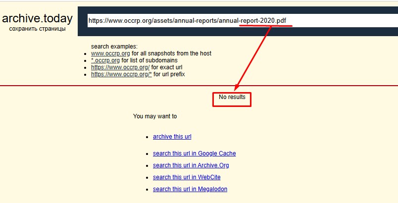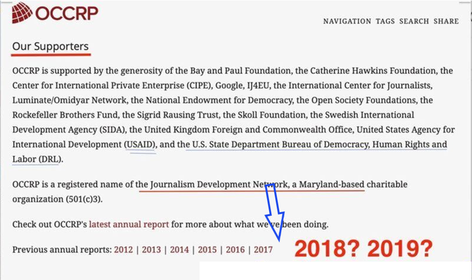 Анонимность и конфиденциальность в плане финансирования стали практически визитной карточкой таких «открытых, прозрачных, независимых» организаций, как «Проект по расследованию организованной преступности и коррупции». «Борцы с коррупцией», требующие от других открытости, прозрачности и деклараций о доходах от государственных служащих, сами не обеспечивают открытость и прозрачность в своих финансовых отчетах. Представленный скриншот был обнаружен в 2020 году. В тот момент отчеты OCCRP за 2018 и 2019 годы не были размещены на их сайте.