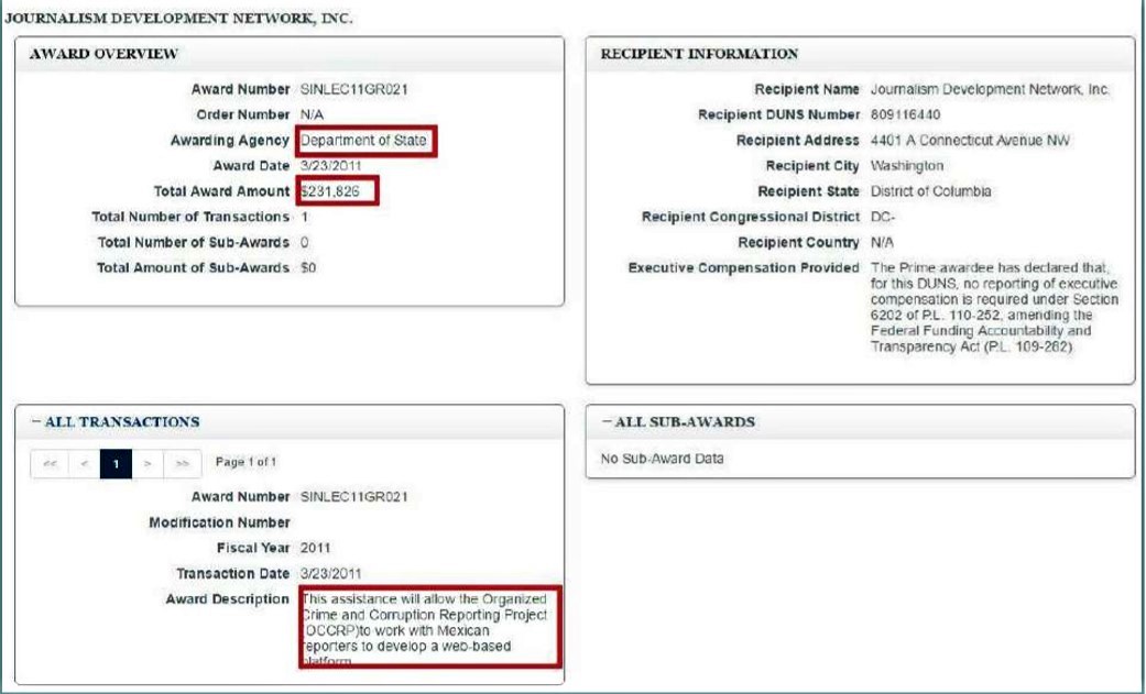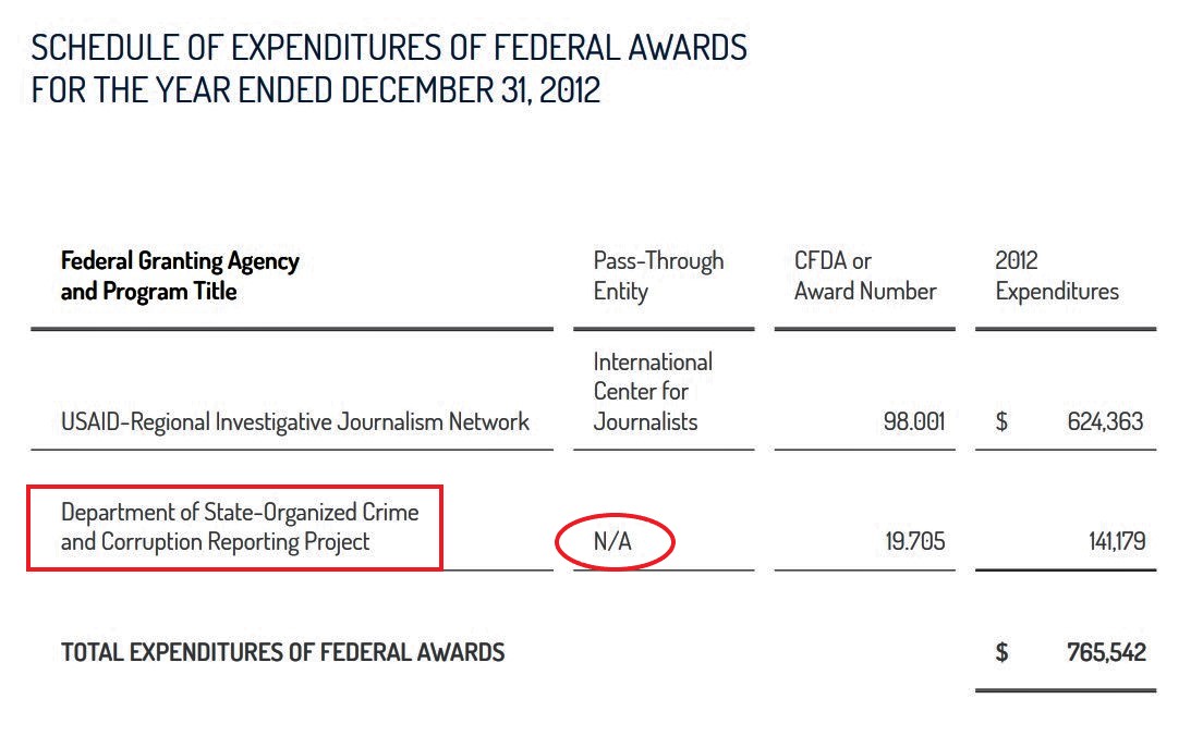 Интересно, что выделение этих средств явно не скрывается, и таким образом нарушаются нормы и принципы международного права. Например, в 2012 году была распростронена информация о том, что Государственный департамент выделил OCCRP грант в размере 141,179 долларов. Также видно из скрина, что в разделе «координаторы» указано «N/A», то есть «данные отсутствуют». Интересно, что эти деньги были выделены на проект с названием, полностью совпадающим с названием федеральной государственной программы, посвященной «Организованной преступности и коррупции». Источник: отчет OCCRP за 2012 год, стр. 62.
