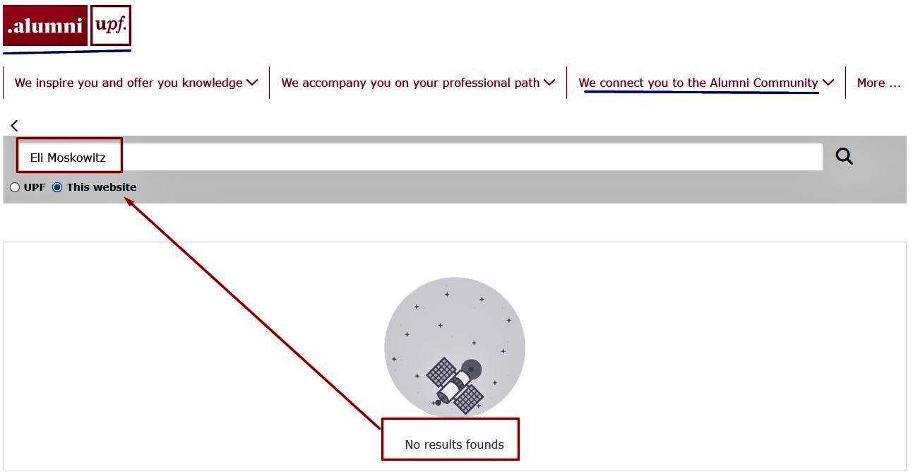 Затем мы проверили страницу «Университета Помпеу Фабра» в Барселоне, где, как утверждается, Эли Московиц получил степень магистра. Однако, в разделе выпускников этого университета  человек с именем «Eli Moskowitz» не был найден.