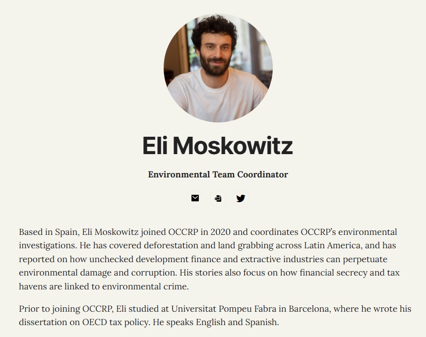 На их сайте указано, что Эли Московиц проживает в Испании. Он присоединился к OCCRP в 2020 году и координирует проекты, связанные с экологическими вопросами. Написано, что он раскрывает факты вырубки лесов в Латинской Америке, незаконного захвата земель, незаконных доходов от переработки природных ресурсов и коррупции. В информации также говорится, что до того, как присоединиться к OCCRP, Эли учился на магистратуре в Университете Помпеу Фабры в Барселоне, свободно владеет английским и испанским языками.