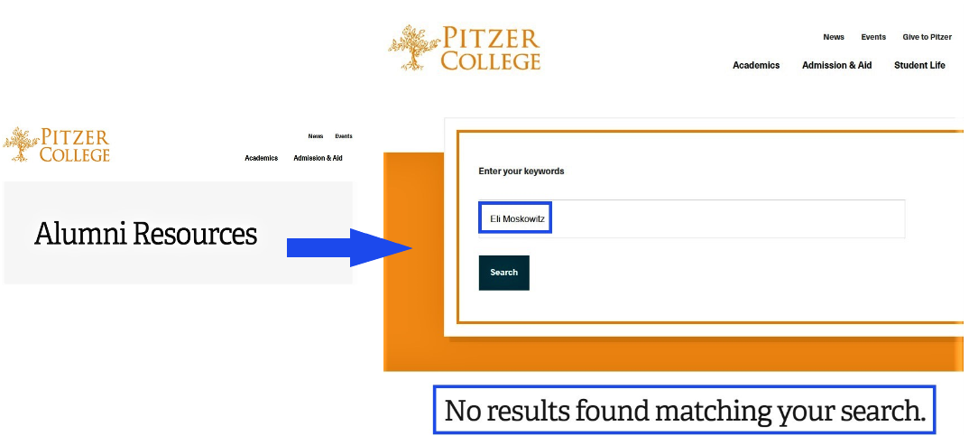 Мы продолжили наше расследование. На его странице в «LinkedIn» указано, что в 2011-2015 годах он получил степень бакалавра по специальности «Политология и психология» в «Pitzer College». «Pitzer College» расположен в Клермонте, Калифорния. Конечно, этот факт не связан с сомнениями, то есть вполне возможно, что Эли Московиц учился в США, даже если он живет в Боснии или Испании. Известно, что все известные университеты и колледжи имеют на своих официальных страницах раздел «Выпускники». Мы искали «Eli (Eliot) Moskowitz» в разделе «выпускников» рассматриваемого колледжа. Результат: