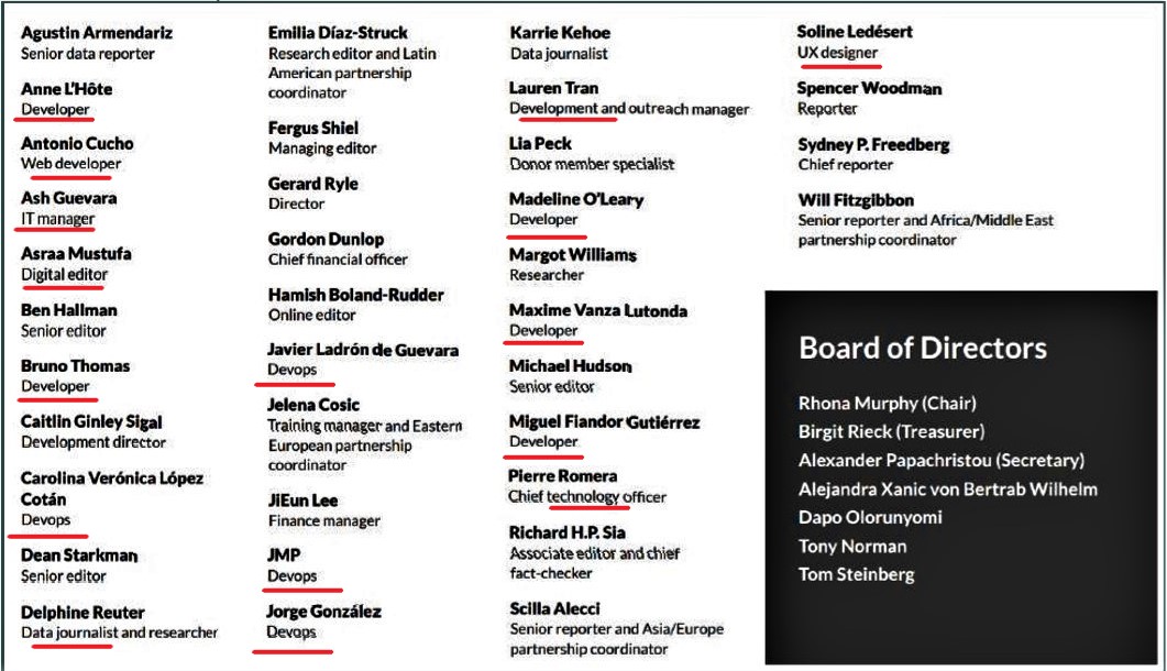 При просмотре раздела «Наши члены» на сайте ICIJ можно заметить, что среди членов организации больше людей с должностями «developer, tech-editor, coder, hacker», чем журналистов.
