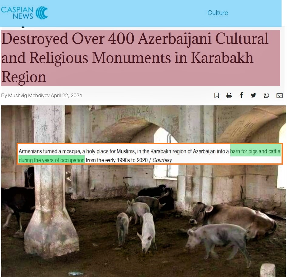 Факты, зафиксированные иностранными гостями, также подтверждают, что Азербайджан не разрушал армянские христианские религиозные памятники. Напротив, именно религиозные сооружения, принадлежащие Азербайджану, были полностью разрушены. На ранее оккупированных территориях было уничтожено в общей сложности 403 религиозных объекта, включая 67 мечетей, 144 храма и 192 святыни. Христианские памятники на этой территории были искажены, а храмы, принадлежащие Кавказской Албании, были подвергнуты фальсификации, присвоены и переоформлены в армянском григорианском стиле.